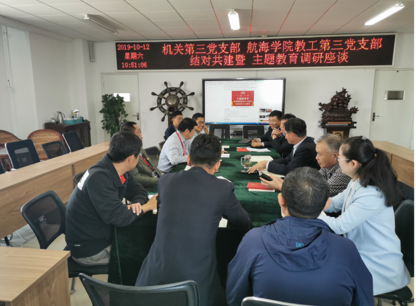 为了扎实开展“不忘初心,牢记使命”的主题教育,深入贯彻落实习近平总书记系列重要讲话精神, 10月12日,航海学院教工第三党支部与威海校区机关第三党支部教学楼B424举行了“不忘初心,牢记使命”主题教育调研座谈结对共建活动。航海学院教工第三党支部与威海校区机关第三党支部的全体党员参加了活动。