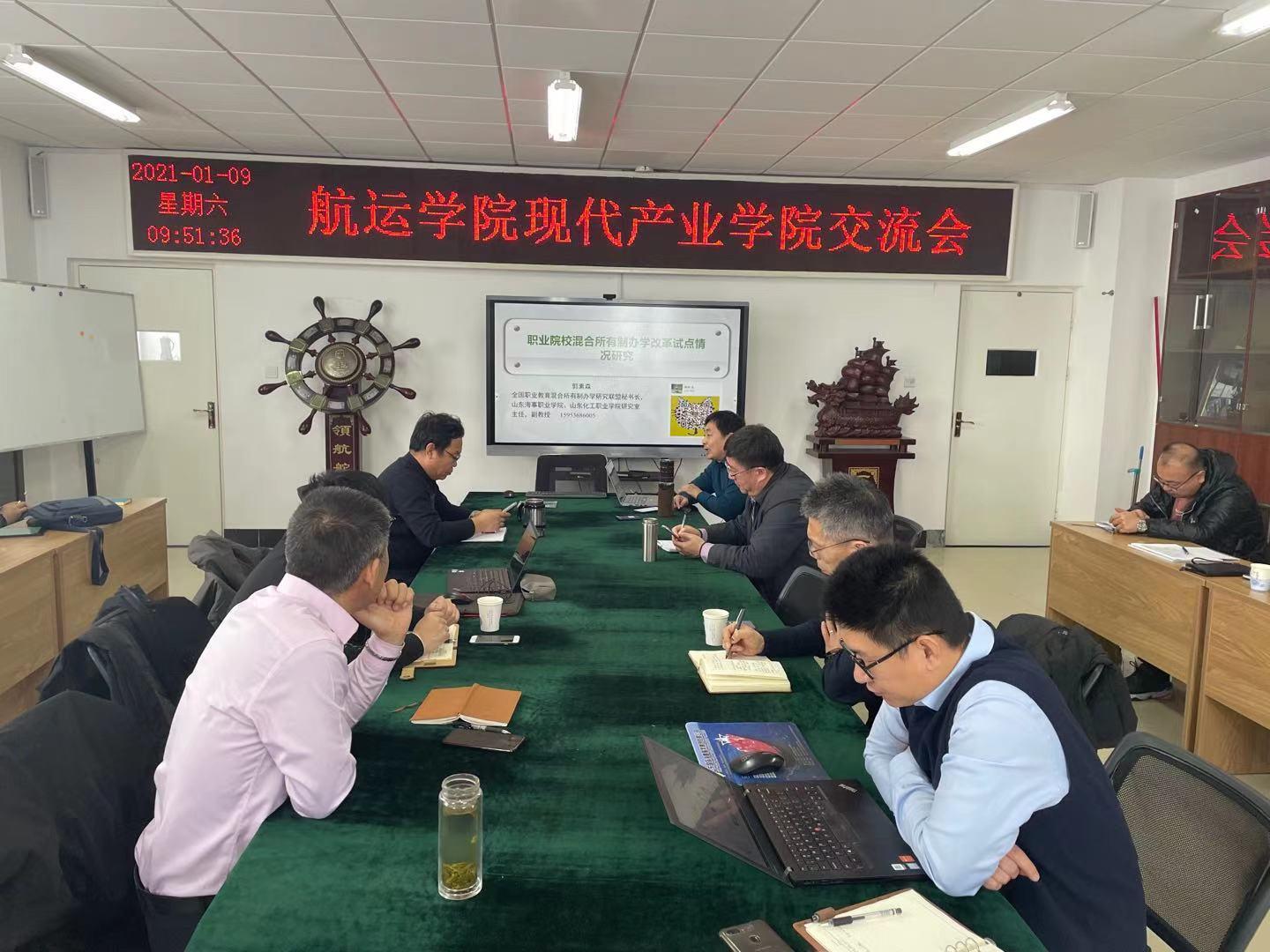 1月9日,山东海事职业学院研究室主任郭素森一行人来色花堂 交流公办院校现代产业学院办学,学院党委书记陈海泳,院长王明雨等参加了研讨会。