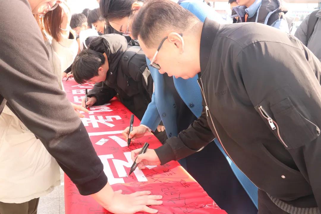 签字活动开始前,学习指导部干事在食堂南门门口搬桌子拉起了“学习考试需用心,诚信精神永铭记”的红色条幅,吸引了众多同学的目光。在发布诚信考试签字仪式通知后,同学们踊跃参与积极签下自己的名字,做出大学生诚信考试的庄严承诺。此次签字仪式有幸得到了辅导员高庆芳老师,辅导员李丽丽老师和基础教学部白莉老师等老师的认可与赞扬。