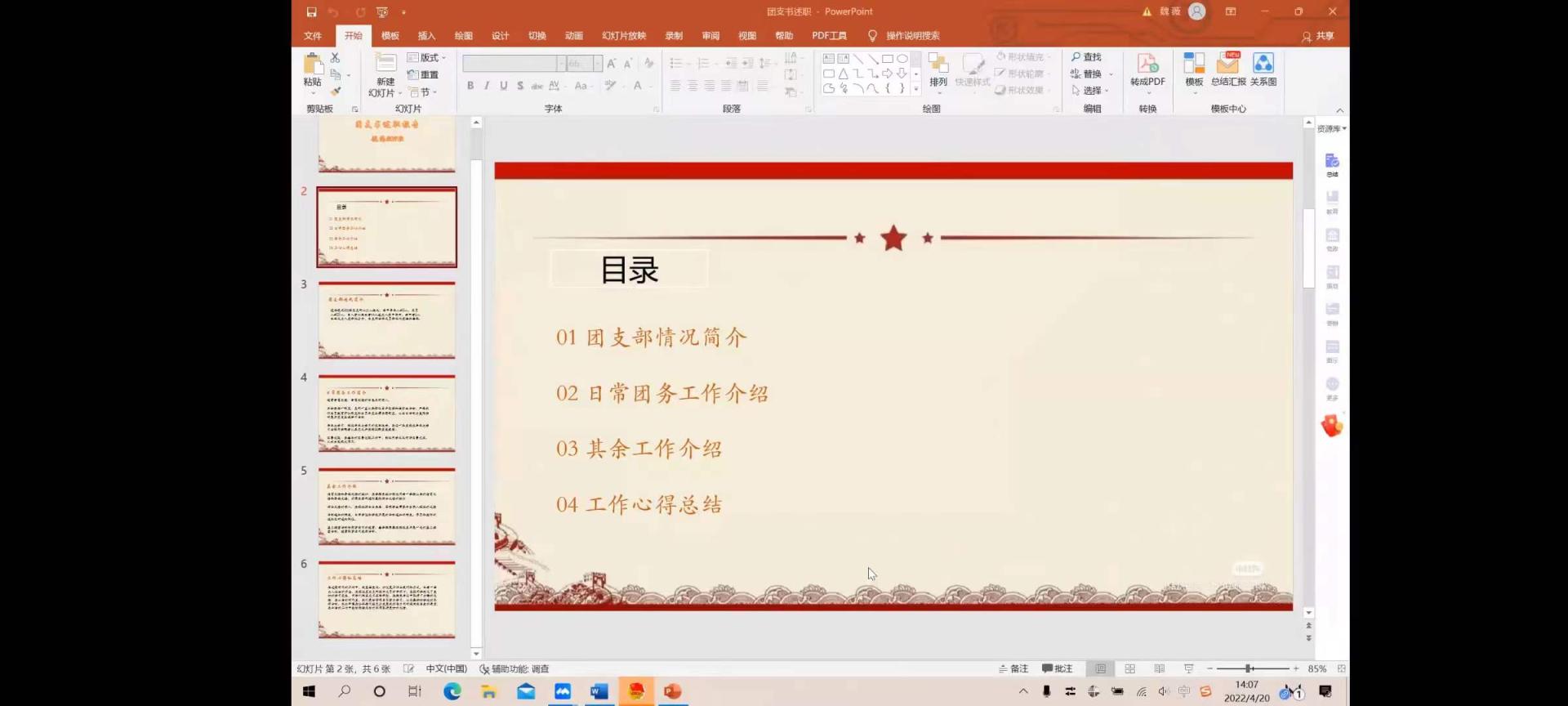 会议伊始,各级团支书按顺序利用PPT形式依次汇报2021年度各团支部的情况,他们分别从班级建设、思想建设、团风建设等角度详细地阐述了上一年度团支部工作开展的思路与方向,结合事例从团支部基础建设、智慧团建工作、团支部特色活动、青年大学习等方面总结得失,分享经验。