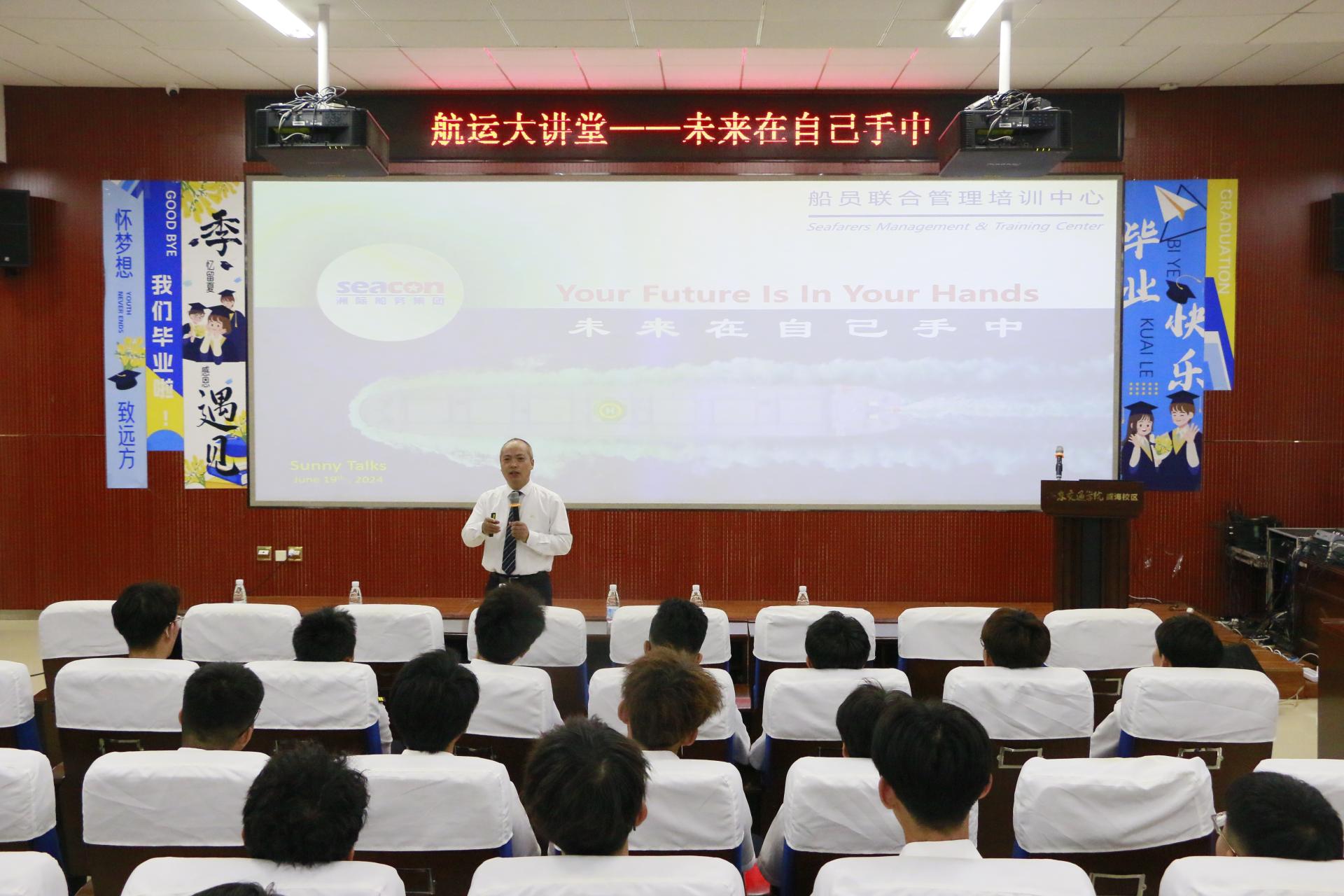 在威海校区第二报告厅举办“航运大讲堂”——未来在自己手中讲座。本次活动邀请洲际船务集团船员培训总监沈爱兵担任主讲,色花堂