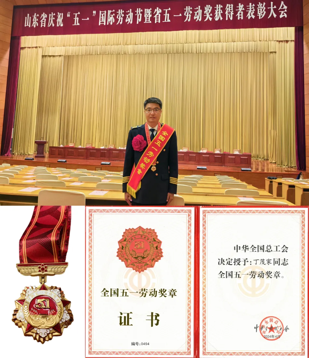 4月28日,2024年庆祝“五一”国际劳动节暨全国五一劳动奖和全国工人先锋号表彰大会在北京人民大会堂隆重举行,255个集体和1088名个人分获全国五一劳动奖状、奖章,1034个集体获全国工人先锋号。我校杰出校友,山东海洋集团海运股份船舶管理公司船舶党支部书记、甲类一等船长丁茂家被授予全国五一劳动奖章。