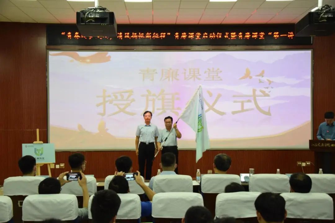 党委书记陈海泳接旗。程伟渊在致辞中介绍了学校围绕新时代廉洁文化建设,在完善体制机制、优化内容形式、丰富传播载体等方面开展的一系列实践和探索,并就“青廉课堂”工作方案做出讲解,最后,他勉励青年干部要在忠诚、实干上下功夫,扣好廉洁从政的“第一粒扣子”,迈出砥砺前行的坚实步履,希望在场师生传承“爱校、敬业、务实、创新”的交院人精神,无畏无惧,勇攀高峰,让青春在实现中华民族伟大复兴的中国梦中绽放异彩。