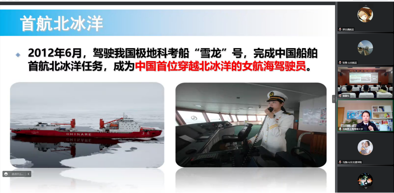 报告会邀请中国首位穿越北冰洋的女航海驾驶员,上海海事大学商船学院船长、博士、副教授白响恩和学校高级船长、中韩客滚船航线第一位中国籍船长黎明杰担任主讲嘉宾。白响恩针对“雪龙号”科考船、极地科考装备等智能装备,结合多年极地科考、极地航道研究和国际航线航行的经验,探讨了航海文化与航海科技的发展;黎明杰分析了大物流背景下航运业的前景和发展方向,并针对中韩客滚船等重点船型,结合自身经历分享了国际航线的航行经验。大家一致表示,此次报告会提升了新时代航海人的责任感和使命感,有助于传承航海文化,增强航海和海洋意识。