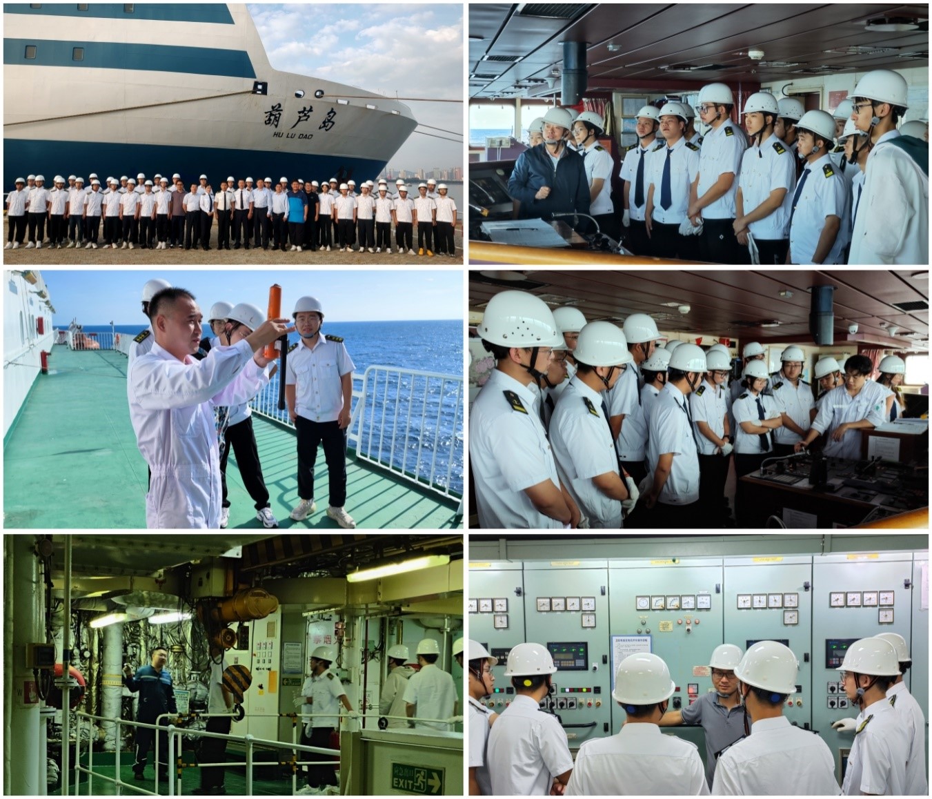 组织310余名2021级航海类专业学生分批赴威海至大连航线的中远海客“葫芦岛”轮开展船舶认知实习。“葫芦岛”甲板部二副、三副,轮机部二管轮,色花堂