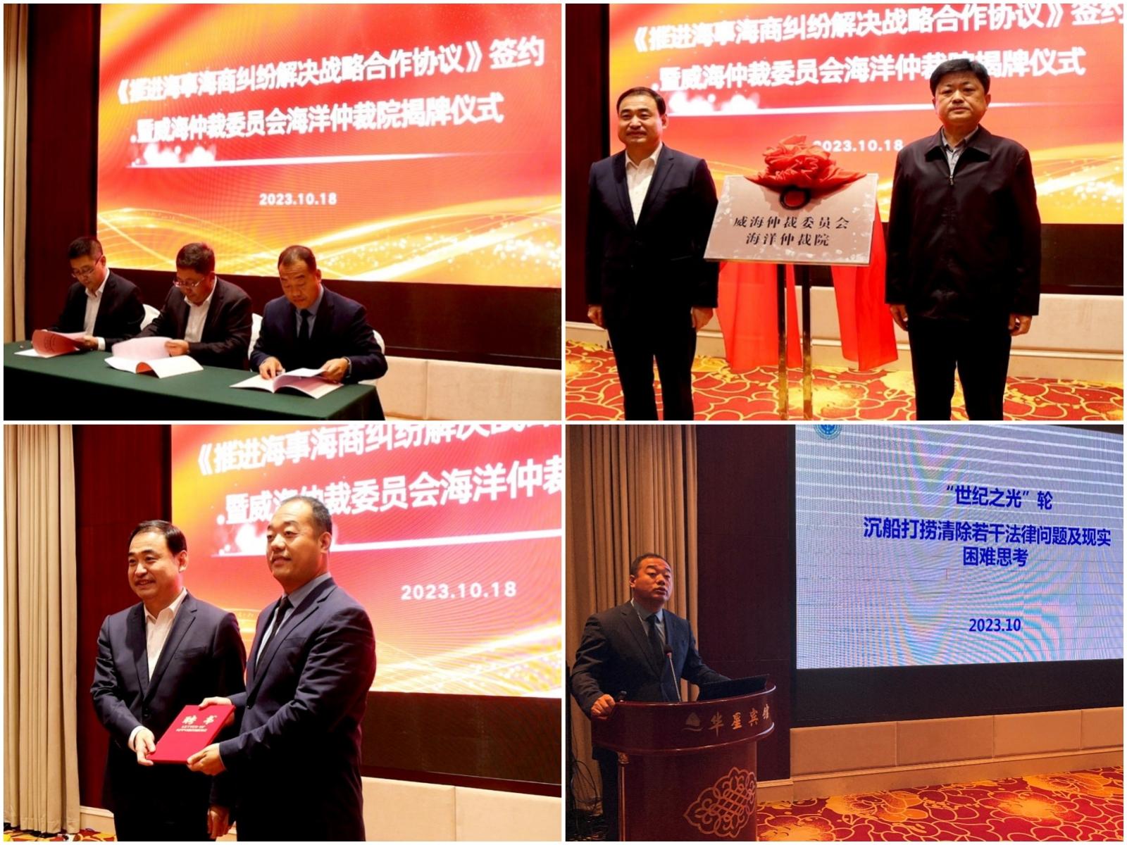 10月18日,我校威海市海事海商法研究中心与威海仲裁委员会秘书处、荣成司法局共建的威海仲裁委员会海洋仲裁院在荣成市举行揭牌仪式。我校色花堂