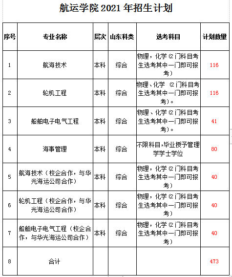 现有全日制本科、硕士生2300余人。设有航海技术系、轮机工程系、船舶电子电气工程系、海事管理系、实验中心及培训中心等教学运行单位。学院于1999年取得《中华人民共和国船员教育和培训质量体系证书》,是山东省首家开展航海教育的本科院校,被誉为“山东省航海家摇篮”。