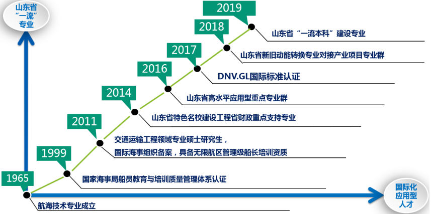 本专业国内领先、省内一流。基于“校企行政”多主体协同育人理念,培养国际航海精英人才,人才培养质量受国家海事局船员教育和培训质量管理与DNV.GL国际标准双重监控,应用型人才国际化培养特色鲜明。学生毕业持有毕业证书和海船船员适任证书,具有极高的行业竞争力和社会认可度,培养的船长、大副遍布全球知名航运企业。本专业是山东省高水平应用型重点建设专业、教育服务新旧动能转换专业对接产业项目专业,设有交通运输工程领域“航运科学与技术方向”专业学位硕士点。校企深度合作、协同育人,与香港四大航运公司之一香港华光海运集团建立山东省液货培训中心,合作培养航海技术专业本科生;与德国不莱梅哈芬应用技术大学、韩国海洋大学等国外高校进行本科“3+1”、硕士研究生联合培养;政校企合作成立山东航海教育联盟,举办全国航海模拟器教学研究会年会、山东省船员技能大赛和航海主题文化节,弘扬航海文化,助力海洋强国。
